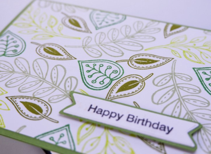 This first card uses stamps from the Doodle Flowers stamp set. I selected just the leaf images, and stamped them in four different shades of green, ranging from bright lime green, to almost brown. I started with the larger images, and filled in the gaps with the smaller leaves.