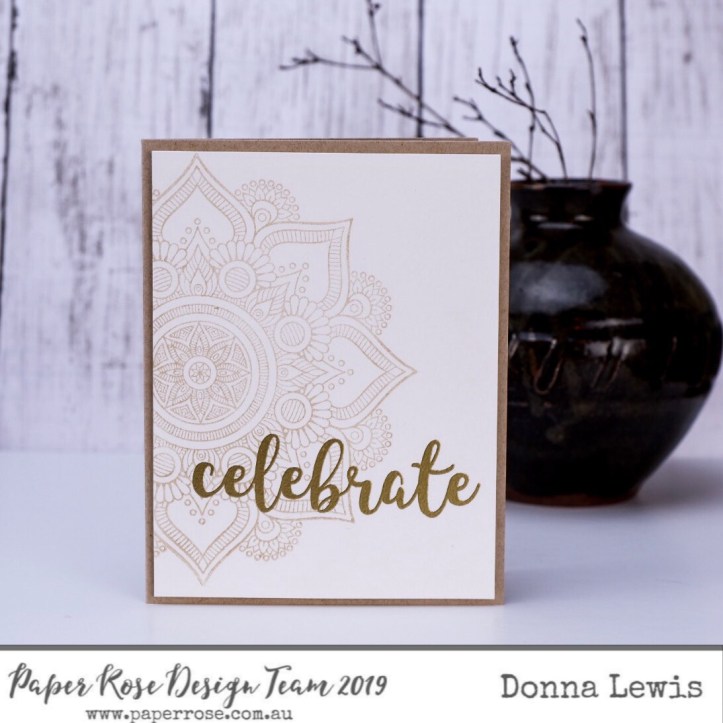 This second card uses the Beautiful Mandala stamp, which I’ve stamped in a kraft coloured ink. The word celebrate comes from the Sentiments 2 clear stamp set. I have heat embossed the sentiment in gold so that it stands out from the mandala, but still doesn’t take over the whole card.