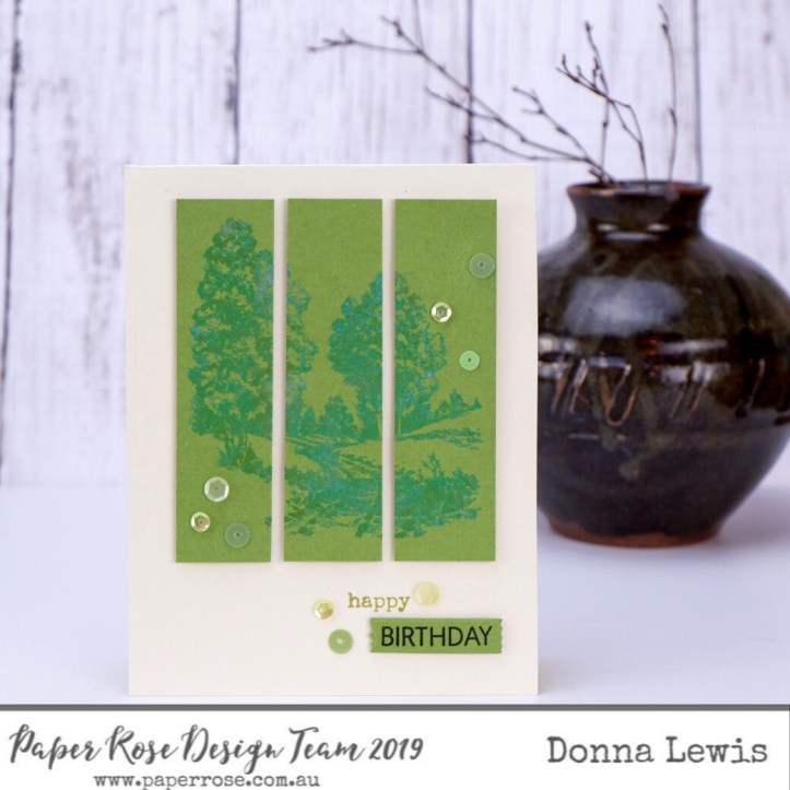 This final card uses the country scene from the Into the Woods Stamp set. I stamped this in Peeled Paint and Lucky Clover Distress Oxides. You can see just a little of the Peeled Paint ink showing through from behind. I then cut the stamped panel into three even pieces to add some interest to the card. I have added a few sequins too, pulled from various sequin mixes in my little stash.