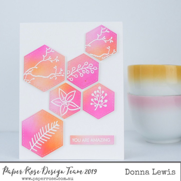 This second card uses the same stamp set and inks. I inked up a piece of white cardstock with the three distress inks, and then cut hexagons using the Stitched Hexagons die, making sure that each hexagon included a mix of colours. I then made sure that the Distress Ink was completely dry before continuing.