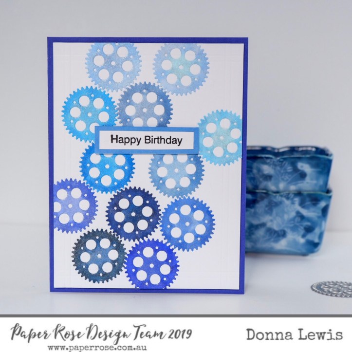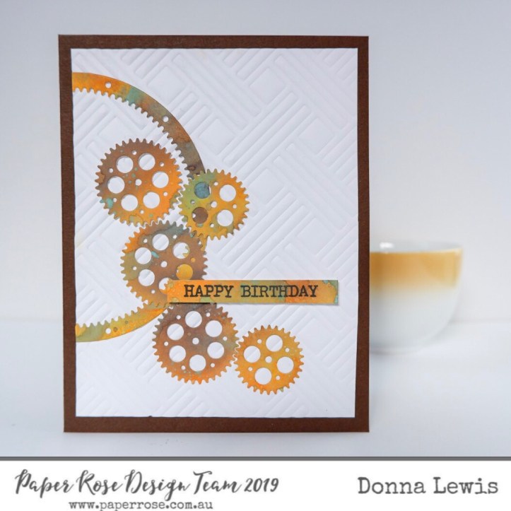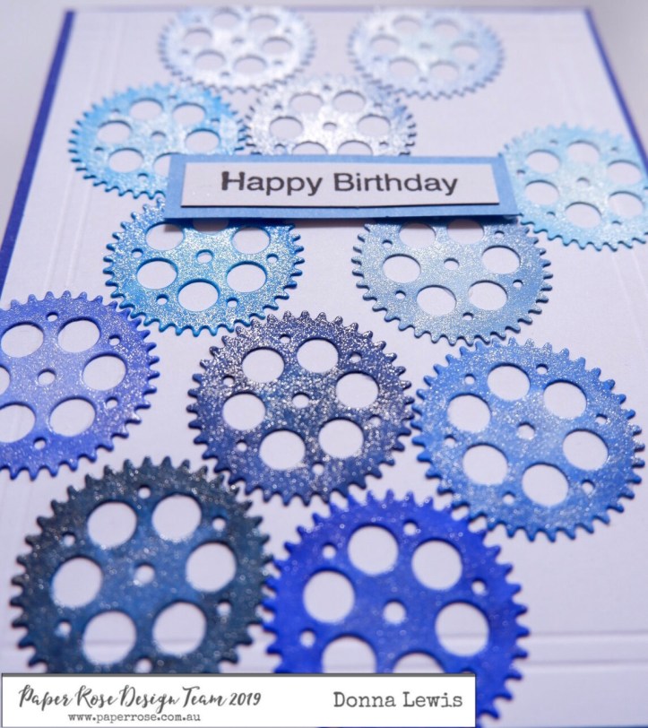 I then cut out the cogs and gears ( what is the difference, I wonder?) using the Paper Rose Cog Frame Border dies in different sizes, and arranged them on the background. The gorgeous colours of the cogs really carry this card, so I kept the design simple.