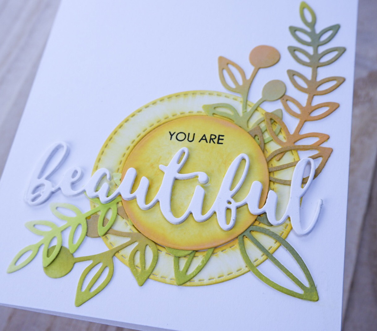 I lay down the ring, then arranged the leaves before adding the upper circle and ‘beautiful’ sentiment. The sentiment is once again cut three times and layered up.