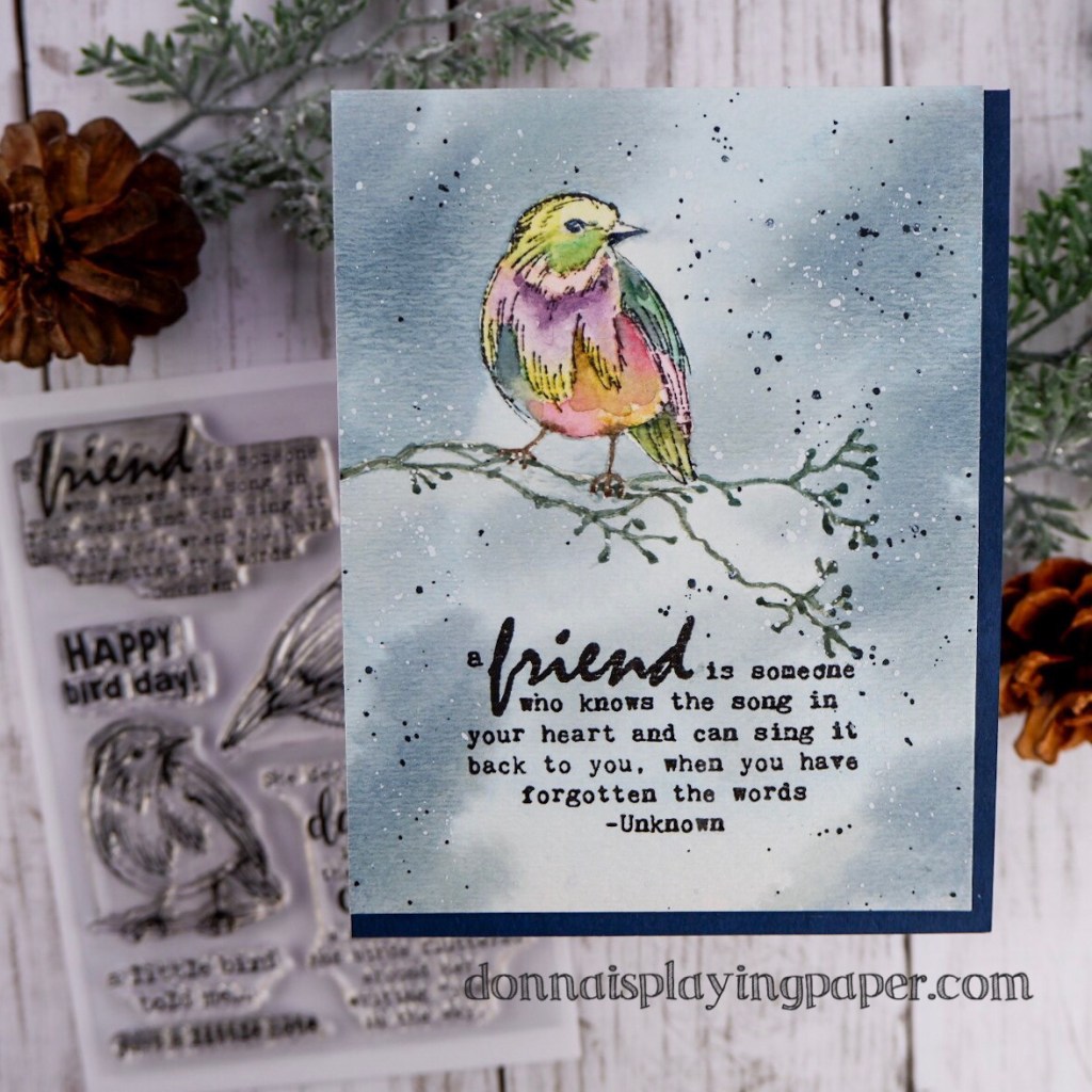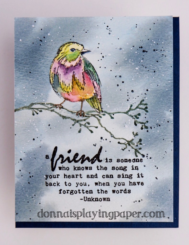 To make this card, I first stamped the bird from the Bird Day stamp set in a pale ink, and water coloured it in layers, starting with the lightest of washes, then building colour up as I went. I used my MISTI, and left the stamp in it so that I could go back and restamp when I was done colouring. When I restamped, I used Versafine ink, which is water resistant. I inked the face and feet well, and left things a bit sketchy on the wings and chest.