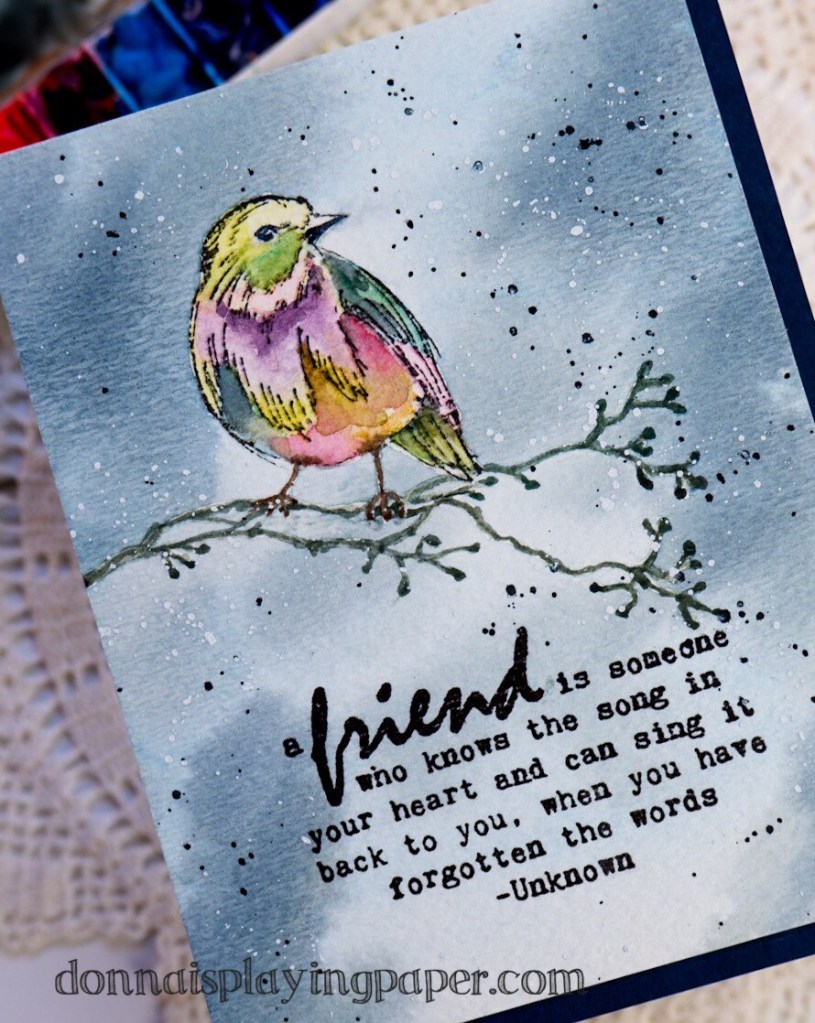 The sentiment was stamped in Versafine ink in Onyx Black. Because watercolour paper is so bumpy, I once again used my MISTI, and stamped it two or three times to get a solid impression, before colouring a few places on the word friend with a black marker. The sentiment is such a sweet picture of friendship – I love it!