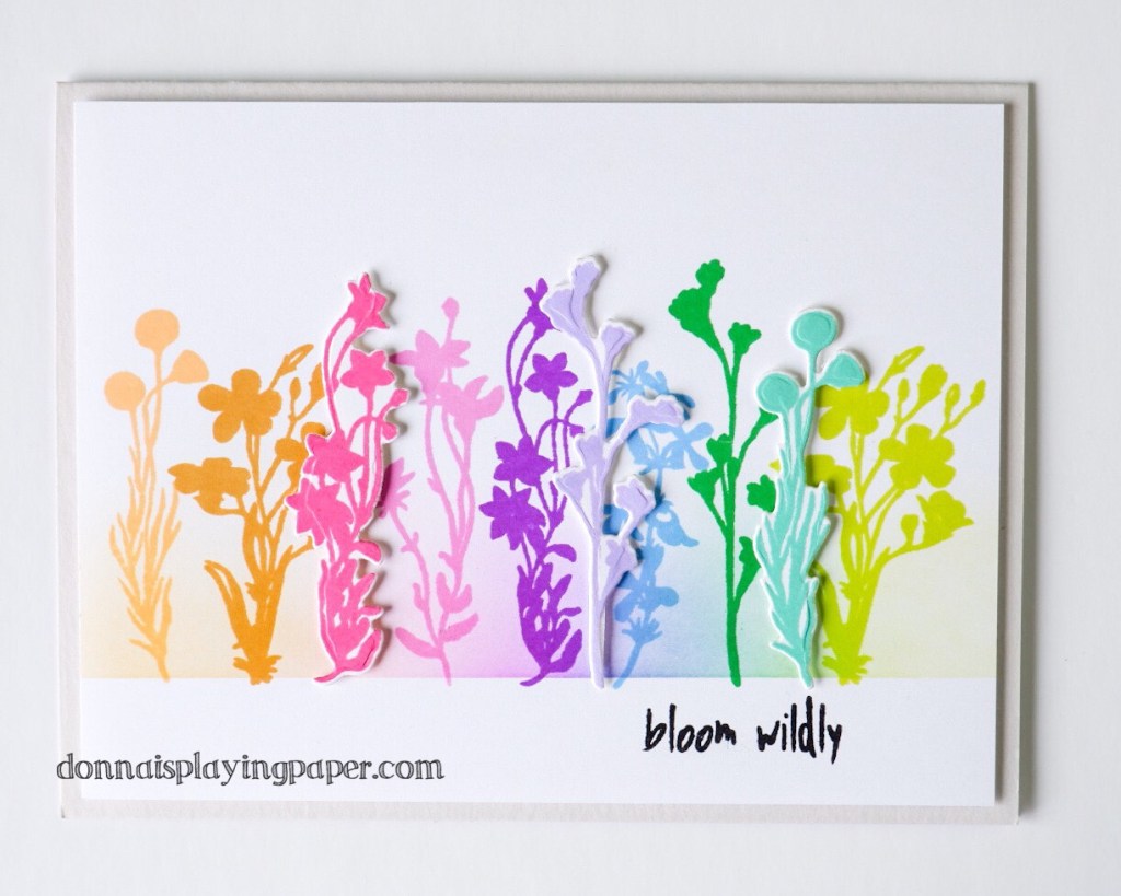 Now, back to the card! I first laid out my 10 inks in rainbow order. I took inks 3, 6 and 9 and moved them up and out of the way. I then took a piece of white cardstock and stamped 7 mixed images directly on the cardstock, leaving out a small space for the remaining three which would be popped up. ( you could choose more or less flowers to pop up, or foam mount all of them if that’s what makes your heart happy!) I then die cut three more wildflowers from cardstock, and stamped onto these using my MISTI. I find that it is better to die cut first with long narrow shapes, because they are easy to accidentally bend when you stamp them, and then the die doesn’t fit the shape very well.