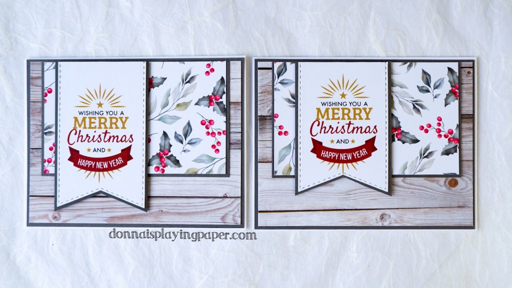 My favourite papers from the pack were ( I use past tense because the paper is all gone!) the woodgrain and the leaf and berry papers. I love how these look together. Many of the cards were made in multiples, like the two below with my favourite papers.