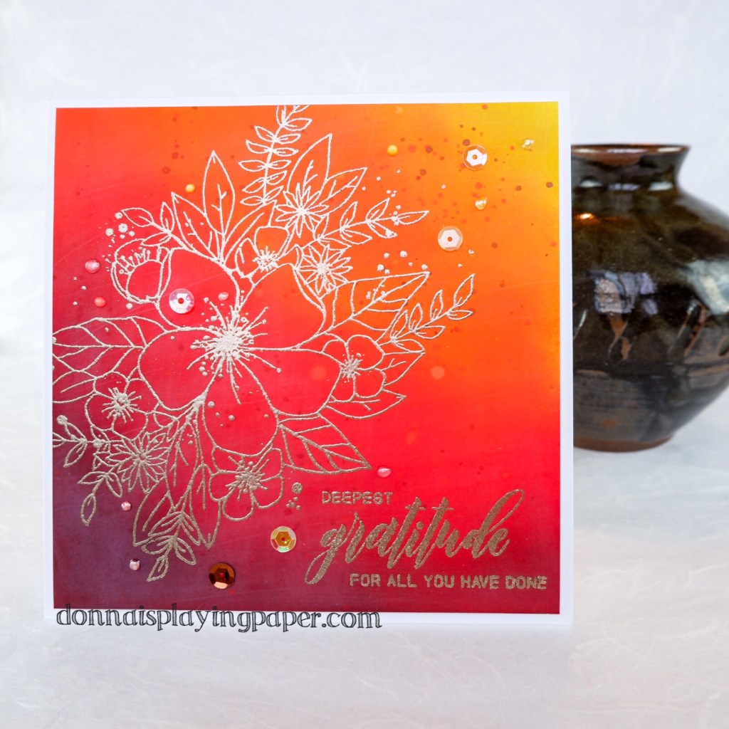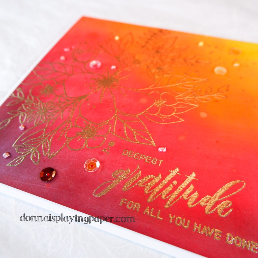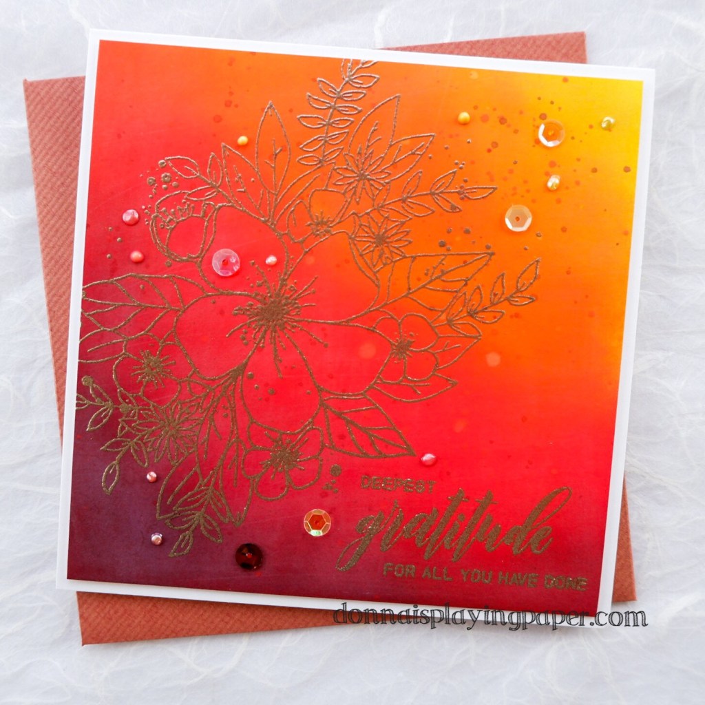 This card is 5 1/2″ by 5 1/2″. I first ink blended the background, using six different colors. These were (starting in the bottom left corner) Aged Mahogany, Candied Apple, Ripe Persimmon, Spiced Marmalade, Dried Marigold and Mustard Seed. I then spattered the whole panel with Ripe Persimmon ink, which I mixed with a little water on my craft mat.