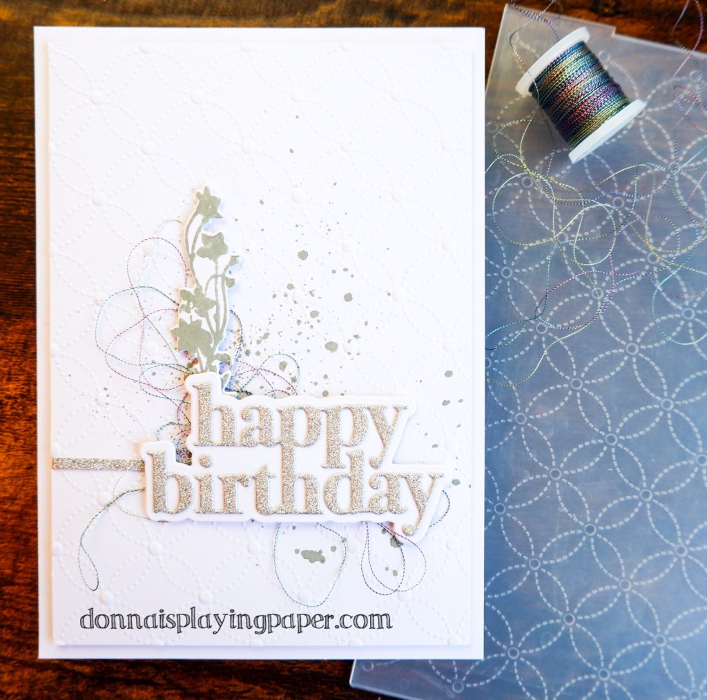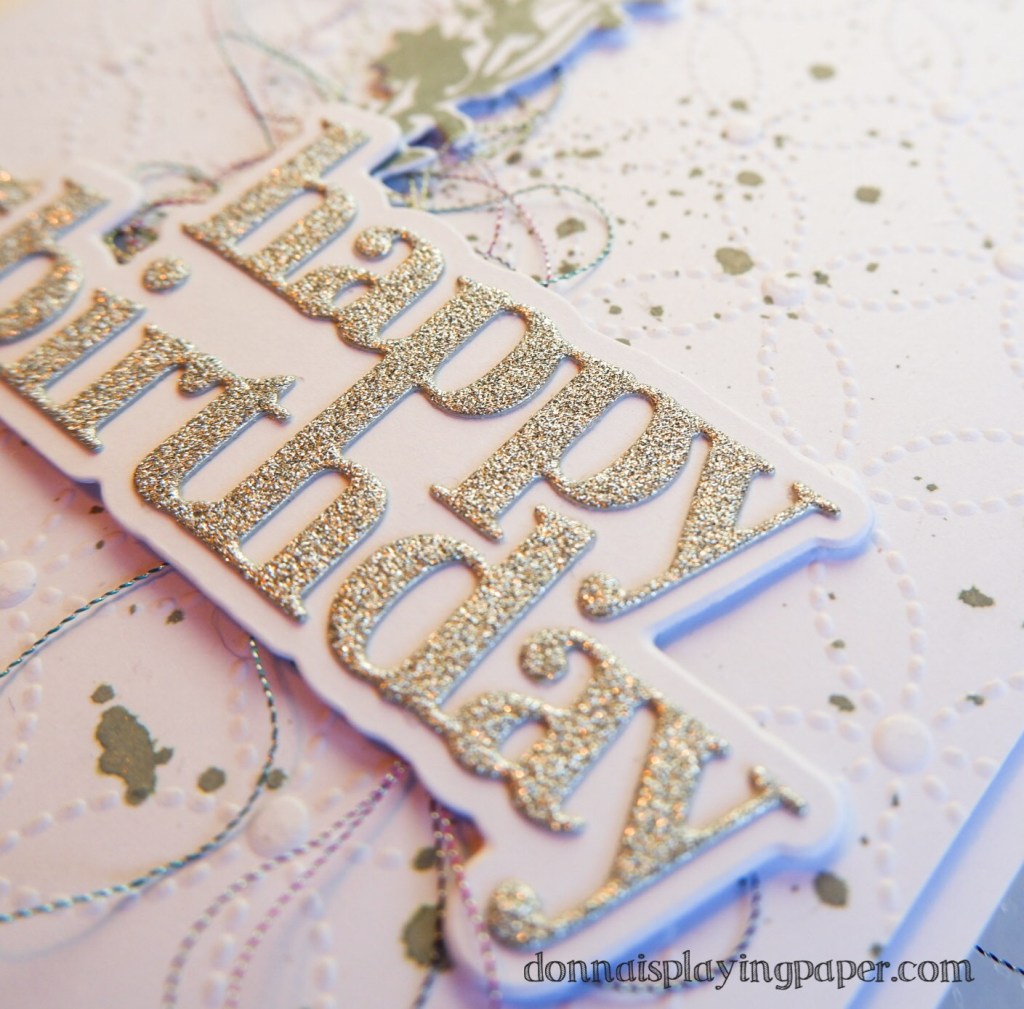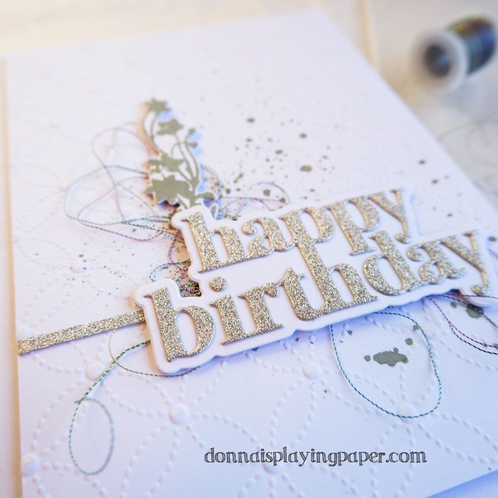I started this card by giving some texture to the background panel using the Hand Stitching 2 embossing folder from Paper Rose Studio. I knew I needed these folders as soon as I saw them, because they are traditional Japanese Sashiko designs, and they are just so gorgeous. I trimmed the panel to just smaller than the card, and then added some spatter, (and some hand painted spats) in a rough diamond shape. The sentiment is the Paper Rose Chunky Happy Birthday die, which cuts a border piece as well as the sentiment. I used white for the background and a rich silver glitter paper for the words.