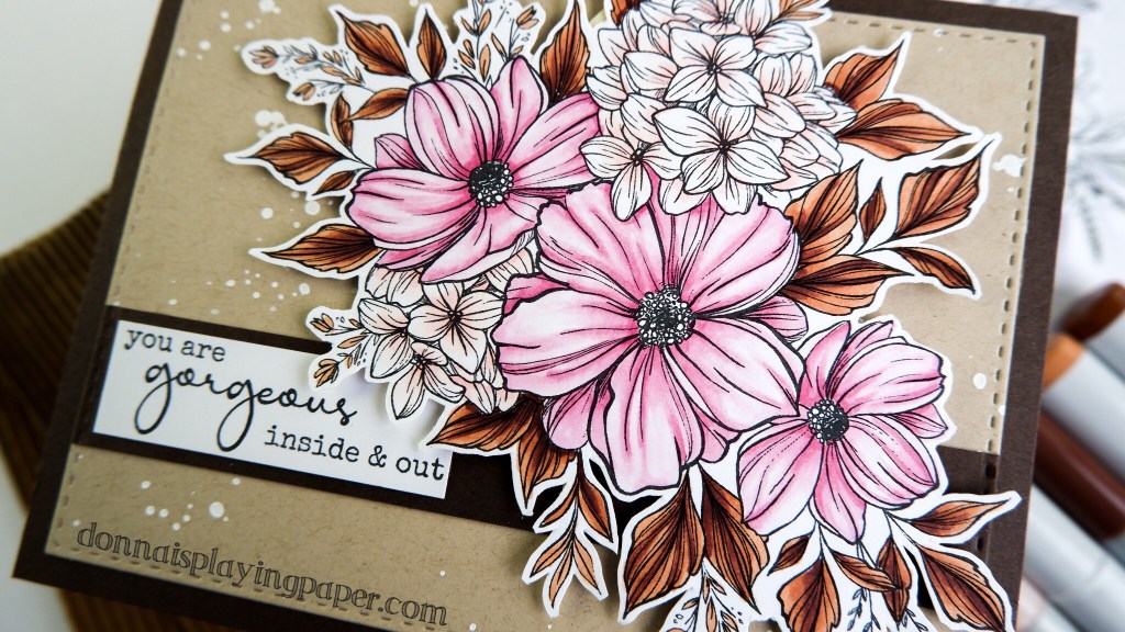 Actually, the stamp does all the work here. This stamp, called Milly’s Bouquet is from Paper Rose Studio and it’s absolutely gorgeous. I decided that such an elegant card needed a very grown up colour palette, so I went with pink, peach and brown. The colouring is the main feature of this card, and because I wanted a soft look, I used my colorless blender pen tip to tip with other colours to get the daintiest of shades. You can see how I did this in the video below: