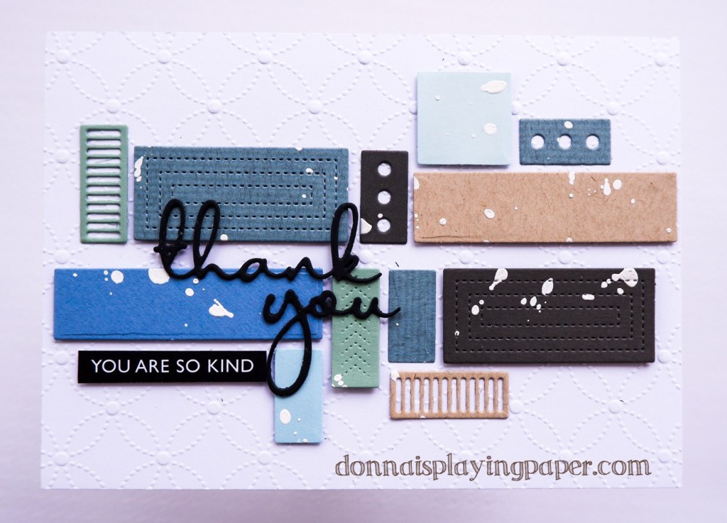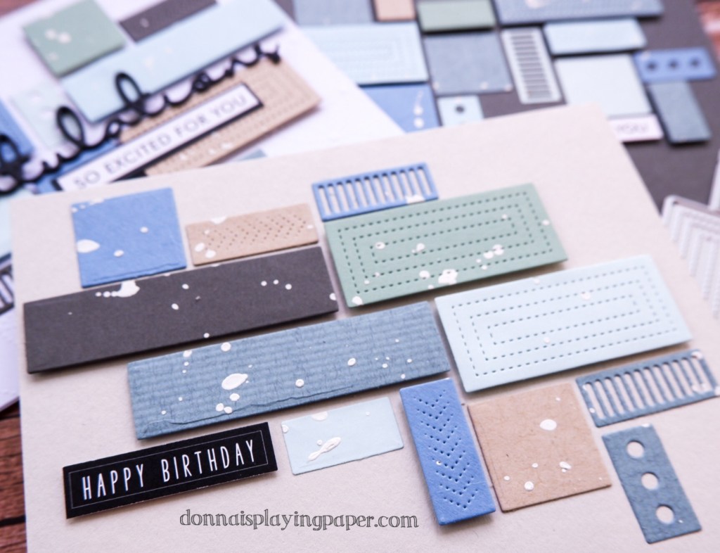 I started with a bunch of paper scraps in blues, greys and browns. Although I love geometric designs, I do like to have something to soften all the straight lines, so I achieved that today with some gouache mixed with water and splashed liberally all over the papers. Once the paint was dry, I cut the pieces using the Card Creator die, to give rectangles with a range of sizes and textures.