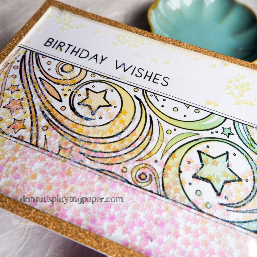 The little iridescent stars worked so well for the shaker. Sometimes shaker bits can take over the design, but these were subtle enough for my hard work to remain visible.