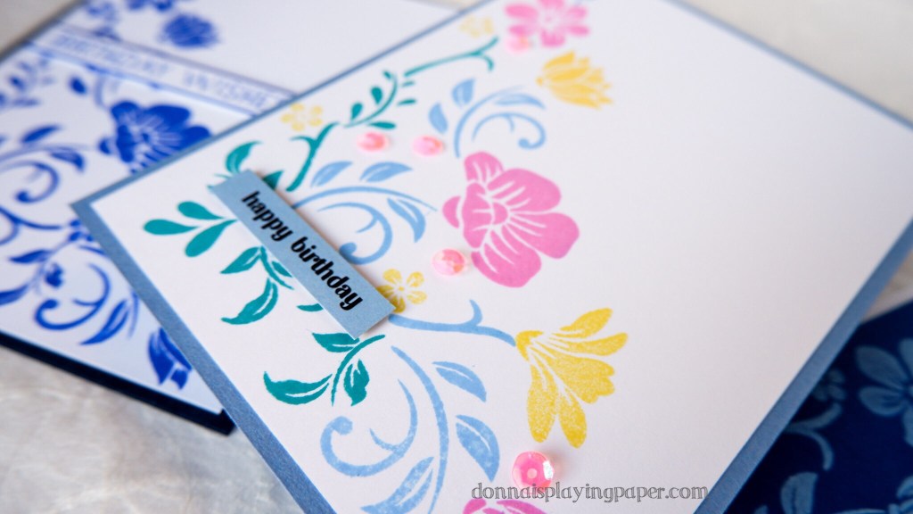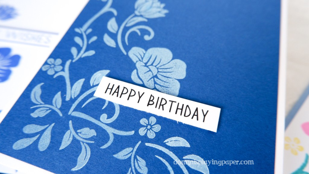 I have a set of three cards for you today, that use a single layout to save time. Today’s card features a bunch of images from the Solid Flowers and Leaves stamp from Paper Rose Studios. This type of card takes a little time to set up, but using a stamp positioning tool, such as the MISTI that I used, and making multiples at the same time make this set of cards quite simple.