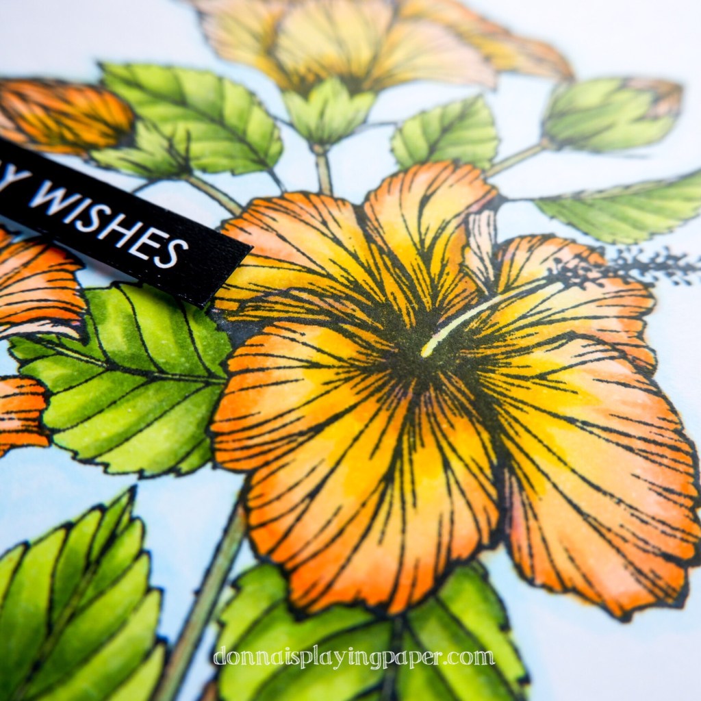 To make this card, I first stamped the image using Memento Tuxedo Black Ink, which is Alcohol marker friendly. I used my MISTI Stamping PlatformI because I wanted the option to stamp more than once to get all the details of the image stamped. I then coloured the hibiscus flowers with my Copic markers. I have a very small selection of markers here in Australia – most of them are in Japan still, so used several techniques to stretch the colours that I could make with them. If you too have only a small number, or are thinking about whether to start a small collection, there are a couple of ideas in the video that may be helpful to you.