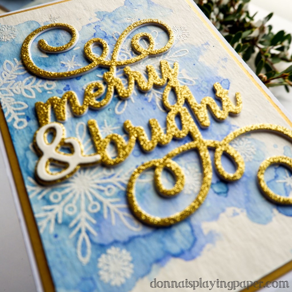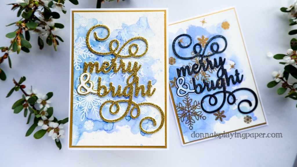 The sentiment is a die from Paper Rose Studio called (fairly obviously) Merry & Bright, and I cut this in gold glitter cardstock for one of the cards. For the other card, I chose black, with a heavy application of Liquid Sparkle on top to give it that iridescent shimmer. For both cards, I mounted the sentiment three layers high, using white card for the lower layers.