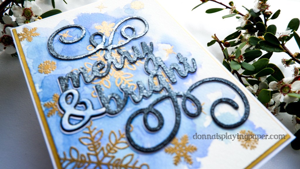 I first made a background of a few different blues, using both Distress Ink and watercolour paints and mixing them on a watercolour panel with lots of water. Once this was dry, I stamped some snowflakes from Paper Rose’s Christmas Snowflakes stamp set with Versafine clear ink, and heat embossed them in Brutus Monroe Alabaster Embossing powder (or in WOW! gold for the second card)