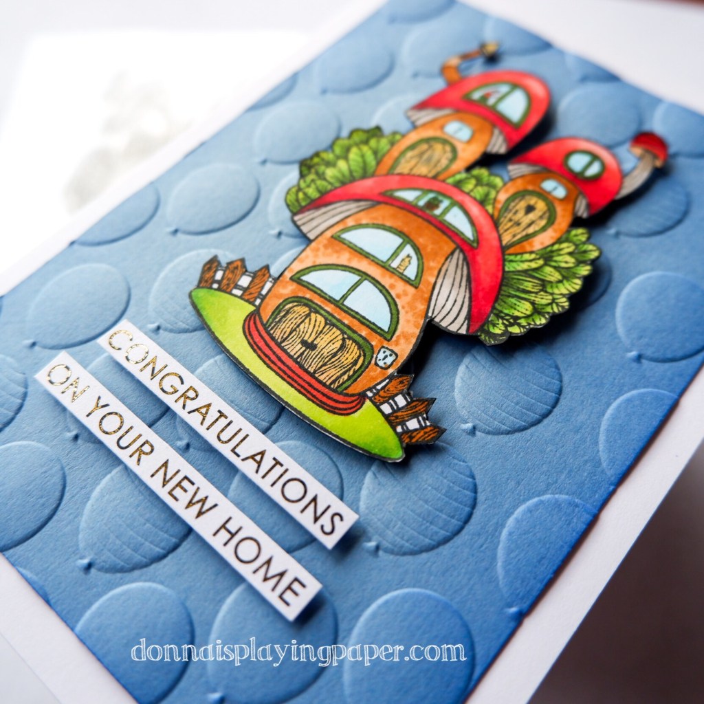 Paper Rose Studio has recently put out a series of three mushroom houses and I’ve used two of them here today. I’ve stamped both houses In Memento Tuxedo black ink and coloured them with my Copic markers. I cut one out with a thin white border, and the other right on the lines, adding an edge with my Memento Tuxedo Black marker to hide some of the white card core. This first card has a background made with Paper Rose’s 3D Balloon Embossing Folder.