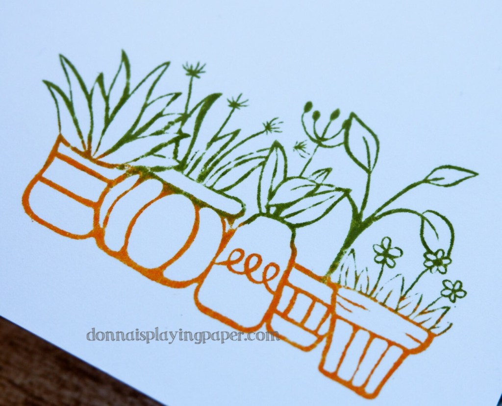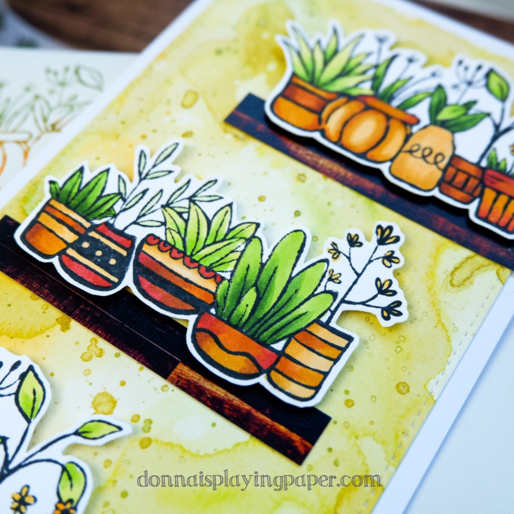 The main images are Paper Rose Studio’s Flowerpot border 1 and Flowerpot border 2. I stamped these onto a separate sheet of white card with Memento Tuxedo Black Ink, and coloured them with my Copic markers.