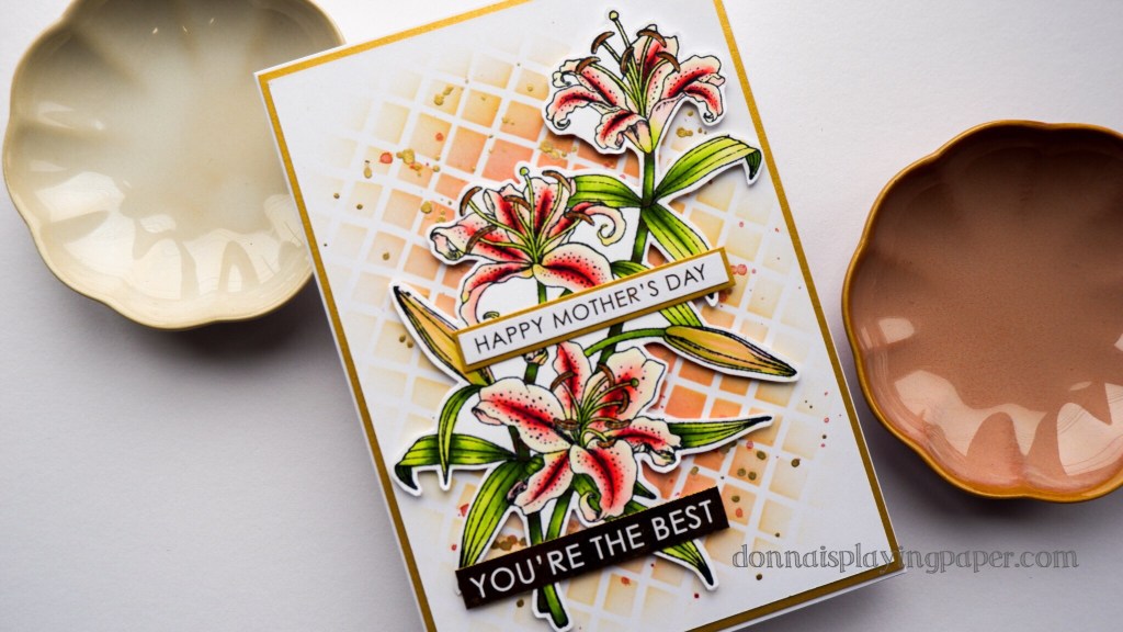 The background for this card was made using the Fish Net Stencil from Paper Rose Studio. I taped it to the back of a precut white card front and then inkblended in the centre with Rosie Cheeks Ink, and then further out with Lemonade Ink, both from Simon Says Stamp. I then removed the stencil, and spattered the panel with Liptick Red Ink, and Gold paint, each mixed with water.