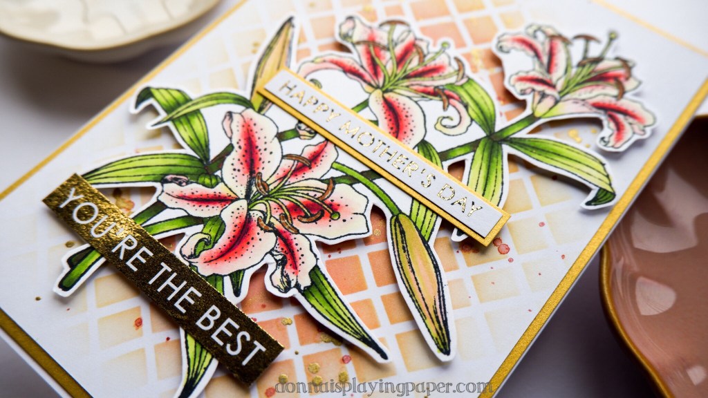 The main stamp for this card is the Lily Bouquet by Paper Rose Studio, and before colouring it, I looked at lots and lots of lily pictures. I noticed that many of them had their deepest colours in the middle of the petals, rather than in the centre of the flower or the edges. This gave me a colouring challenge, and I really wanted to do justice to the beautiful stamp. Eventually I settled on a flower that was deep pink in the centre and pale yellow on the outside. I used a bunch of Copic markers, 7 or 8 for the petals! I could have made do with four colours only, but the extra colours made blending much easier, and I was thrilled with the result.