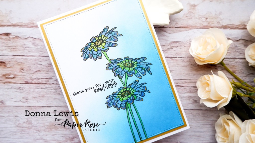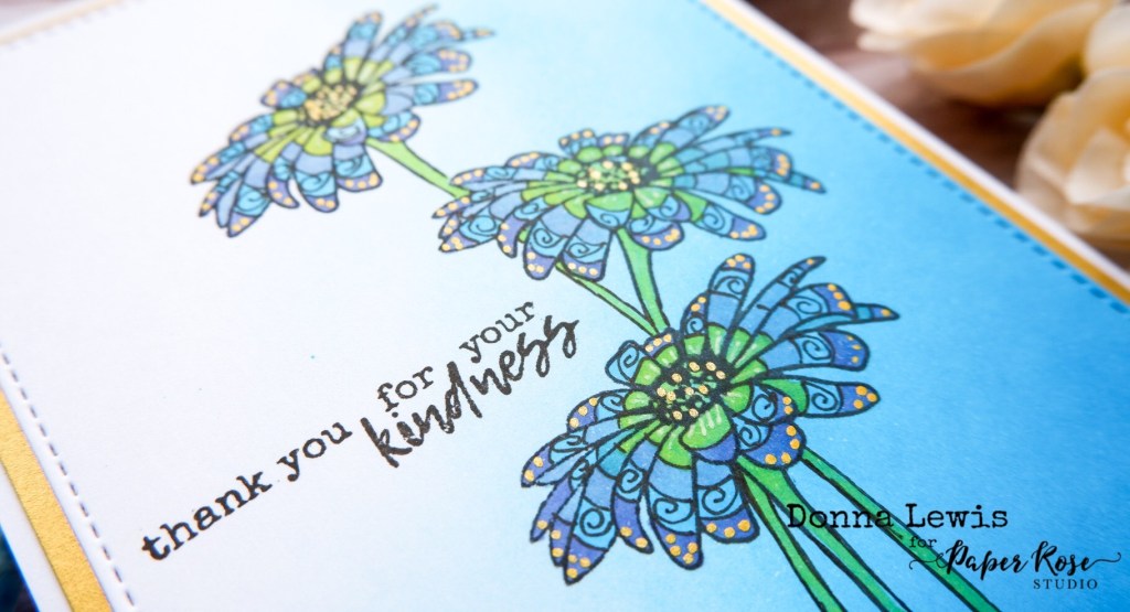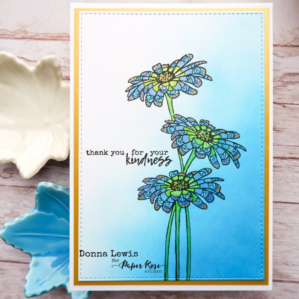 To create the background, I ink blended. I used a card front panel from Paper Rose Studio and Island Blue ink from Simon Says Stamp. I blended darkest in the lower right corner and let the ink fade out towards the top of the panel. I then stamped the daisy image three times, and filled in the stems with my pen, before making some extra lines on each petal. I divided each petal into several sections with some curved lines, and added some spirals.