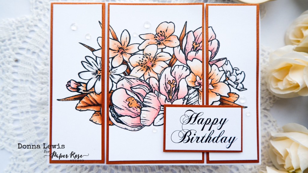 The image for this card comes from a stamp called Spring Blooms from Paper Rose Studio. I stamped the image in Memento Tuxedo Black ink , which I know doesn’t smudge with Copic markers, and then coloured it in. I chose an unusual colour scheme with brown leaves, just for a change.