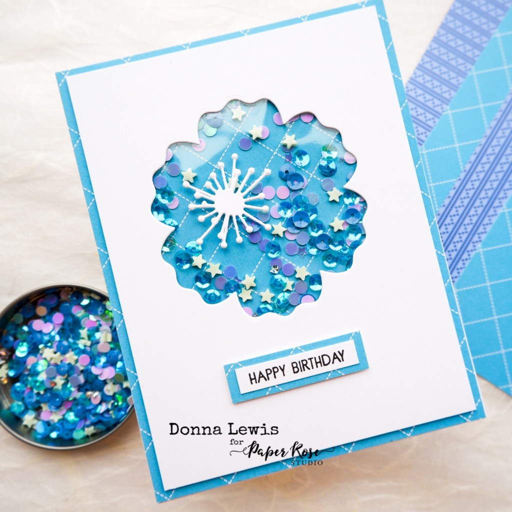 Next , I used the negative space to make a shaker card with some more bright paper from Happy Stitches. I filled the space with a shaker mix from Paper Rose Studio called Winter Sky All the details of the shaker construction are on the video above.