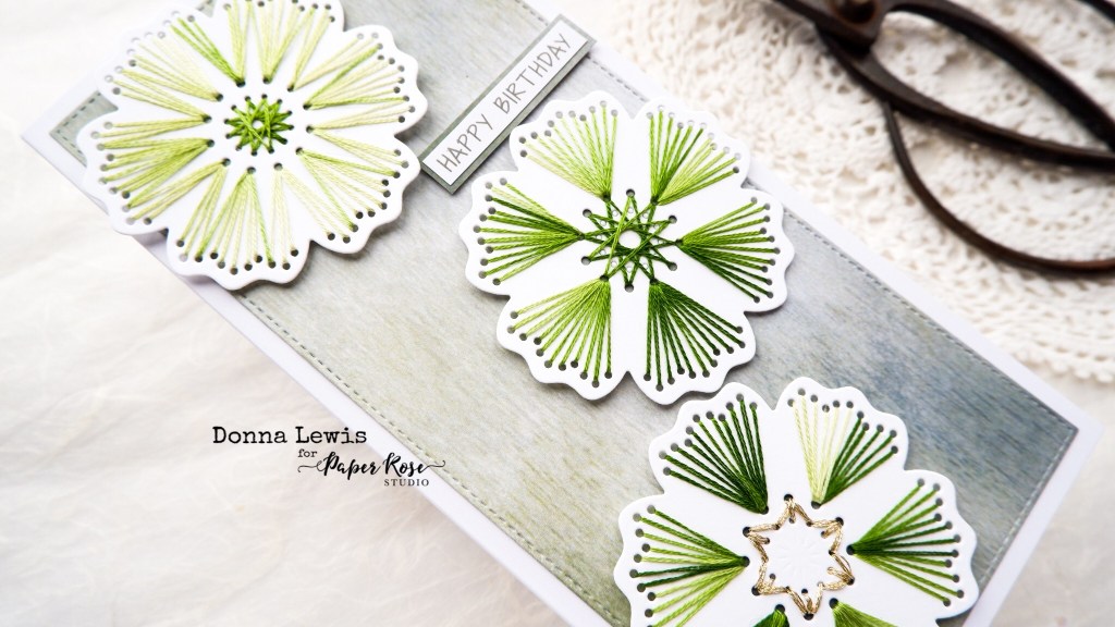 Next, I cut three Stitching Flower 1 flowers. I have stitched these all slightly differently to show some of the possibilities, of which there are many! The cotton was DMC 92. I used a slimline card and added a background paper from a paper pad called Eucalyptus Dance, which I cut with a slimline stitched rectangle die. The sentiment comes from a set called Rainbow Poppies. You knew I couldn’t resist!!