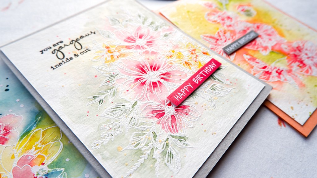 I know there are a lot of people who are nervous about watercolour or who are are worried about letting it do its thing but it’s not that scary as long as you remember that it’s going to look bad before it looks good! There is nothing more terrifying than half dry paint. Anyone who has painted rooms will know what I’m talking about. These cards use a variety of stamps, heat embossed in white, then loosely coloured by first wetting the paper ( I used watercolour paper for all three cards), then dropping colour in.