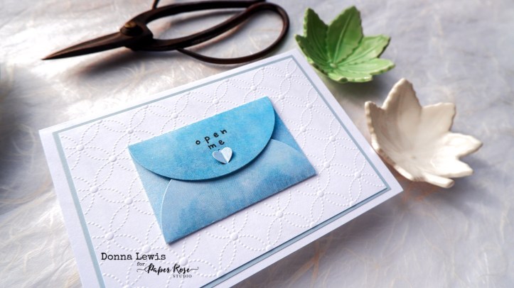 There are so many ways to use envelopes on cards, and I have just four examples today, using three different envelope dies from Paper Rose Studio. This first one uses the Envelope Die 1, and I’ve added a surprise happy birthday sentiment inside the envelope. I wrote the Open Me by hand, starting with the middle letters and moving out to keep it central. The background of this and the next card was made using the Hand Stitching 2 embossing folder. It’s a traditional Japanese stitching pattern, and I love using it on so many of my cards. I love the way this die cuts a little heart shaped tab to keep the envelope closed.