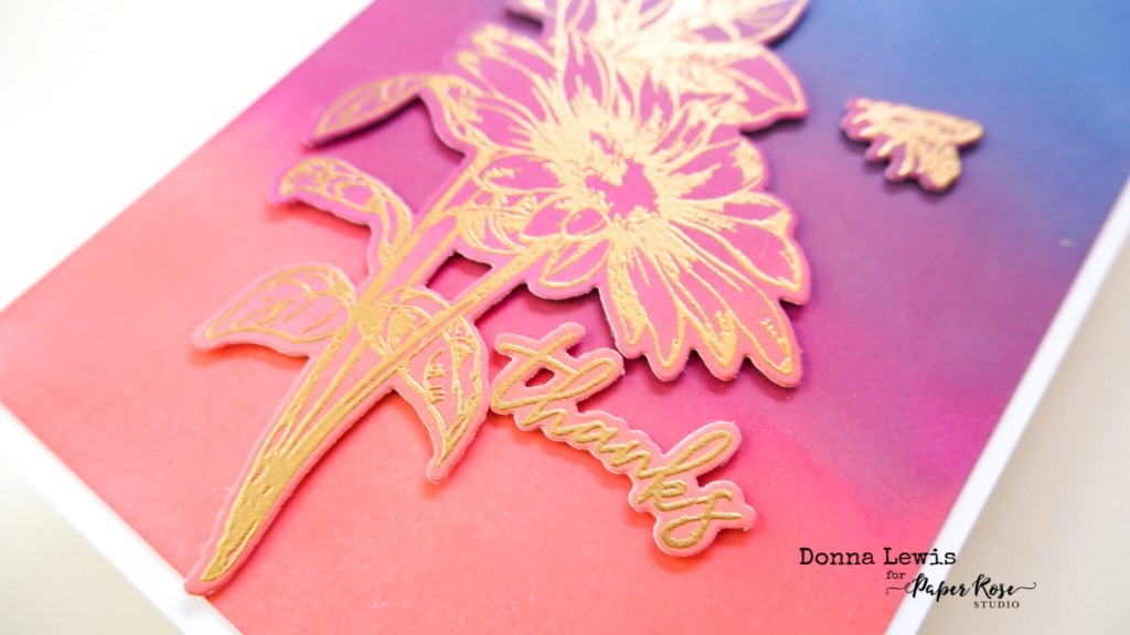 The stamp set that I chose for today is called Sketchy Florals Thanks. I used both the stamp set and the matching dies for today’s cards, stamping and embossing with Gold Embossing Powder. I also stamped one of the sentiments from the stamp set in the same way. For the second card, I used a sentiment from a new to me set called Bright Days Ahead Embossed Sentiments. The writing is slightly raised, and really shiny.