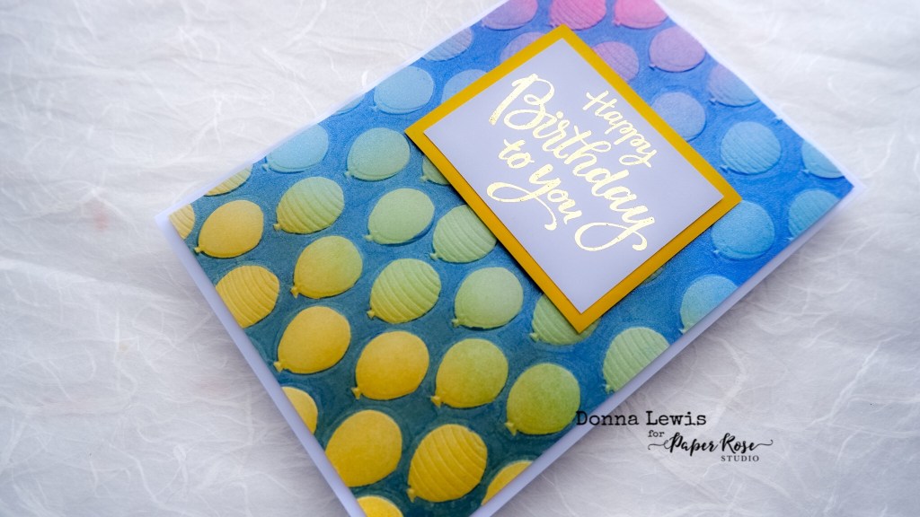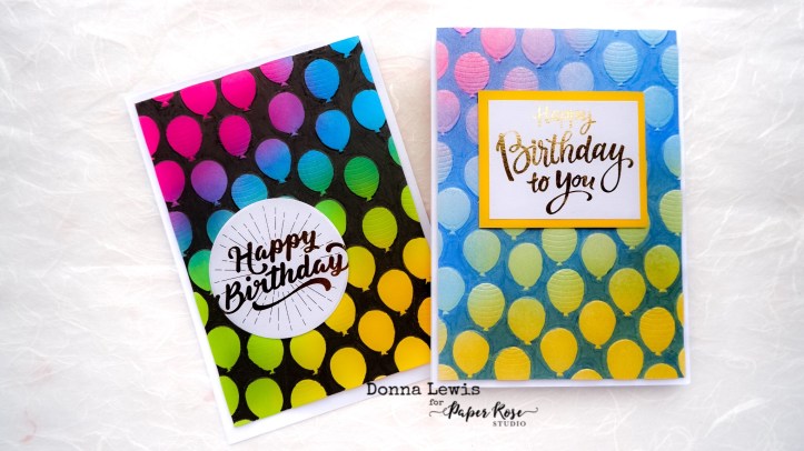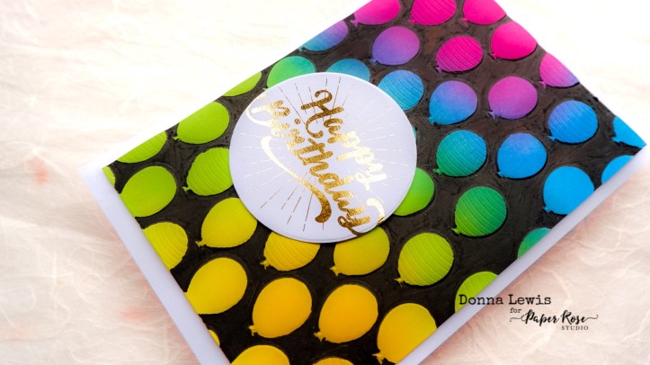 Once I had my coloured panels, I ran them through my die cutting machine with the 3D Balloons Embossing Folder from Paper Rose Studio. For the first card, I then took a black Copic liner and coloured everything that wasn’t a balloon black. For the card below, the process was the same, but I used Daisy White Shimmer cardstock from Paper Rose, which has a very non-porous surface. This meant two things. Firstly, the colours were not as vibrant, and secondly, I could colour the not-balloons with a Copic marker, because the marker wouldn’t sink into the card and bleed.