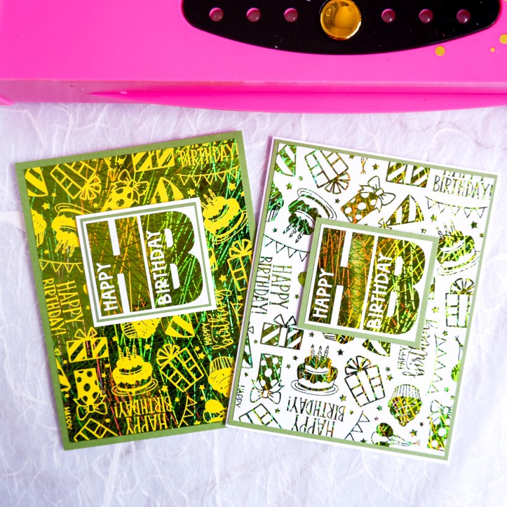 I also did a bunch of regular foiling, I really enjoyed taking the foil after the first run, and layering it onto Foilables Rainbow Toner Sheets. These toner printed sheets are in a mix of gorgeous bright colours, so you can see that in the example below, I added the green foil to a yellow sheet. These are going to double the use I get out of the foils, without having to use a black background.