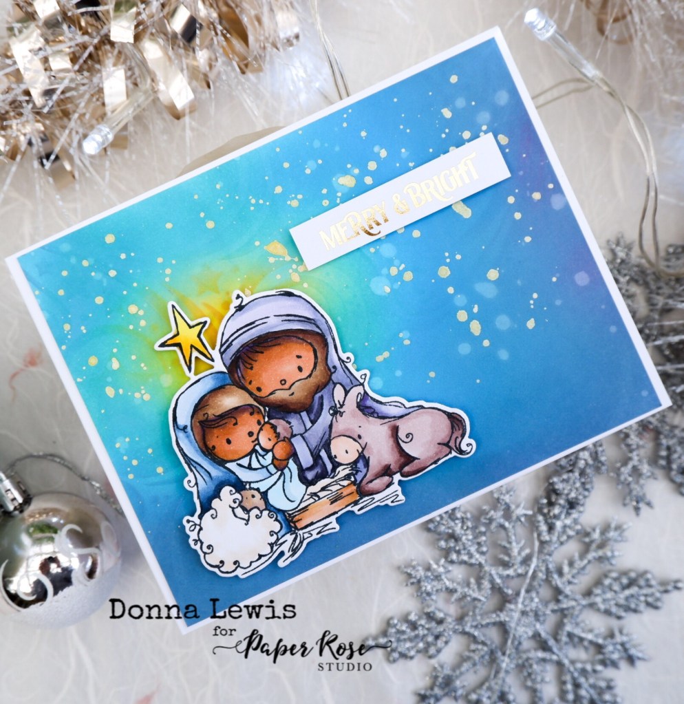 I stamped the image from Paper Rose Studio’s Nativity stamp set in Memento Tuxedo Black ink and then coloured it with my Copic markers. Given that they were middle eastern, I’ve given Mary and Joseph brown skin, using Copic markers E35 and E13, with an undercolour of V17 for the shadows. I cut the image with the matching Nativity die.