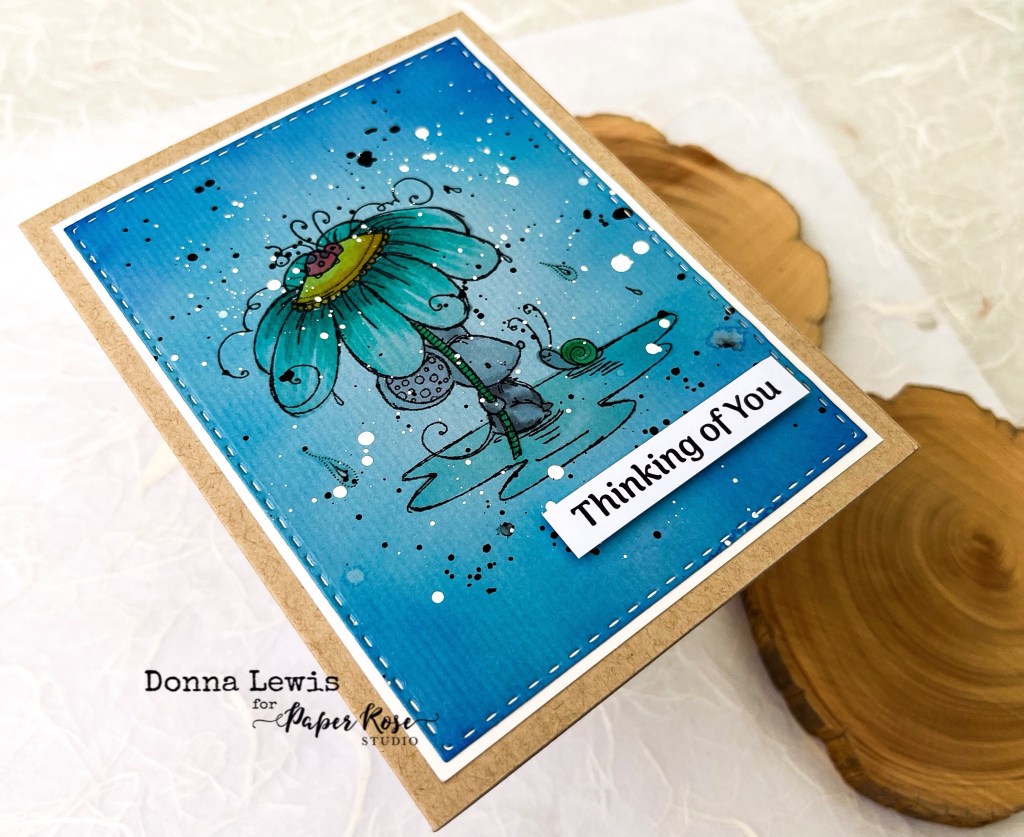 Today’s step uses the Friendship mouse stamp from Paper Rose and I’ve stamped that with Memento Tuxedo Black ink and coloured it with my Copic markers. I have also doctored my paper a bit, by inkblending around the edges with deeper blue inks, and of course cutting it with a stitched rectangle die.