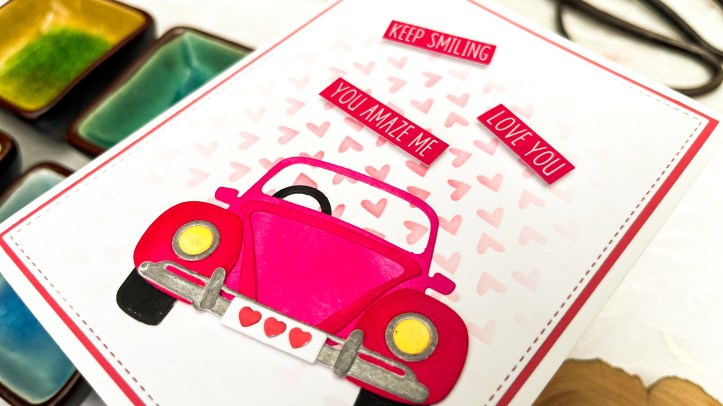 Hello crafty friends. This fun die reminded me of something from my teenage years that I’d completely forgotten! As teens, my friends and I decided that a pink Volkswagen convertible was the car of our dreams. As it often is with teens, it was a collective favourite – I’m not sure who came up with the idea. But, as time went on, (and I married a man with a yellow Nissan) the dream was forgotten, or perhaps moved on from. I can’t imagine driving such an attention attracting car now- I’d rather drive unnoticed! ( Actually, I’d rather take the train!)