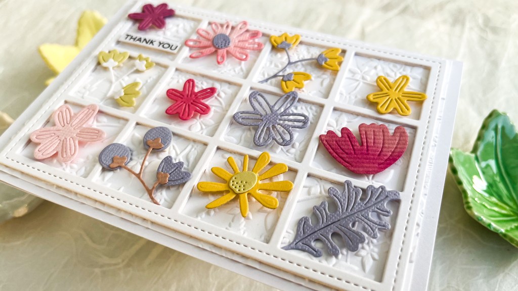This next card? Also my favourite! And super easy to make, with no decisions about constructing a bouquet. Each flower has its own little home! I used the card creator 3 die, and stacked it three layers high for this card. This die suits metric sizes of paper very well. I then just popped up different flowers with foam tape, one for each box. A tiny thank you in the corner is a nice little subtle sentiment.