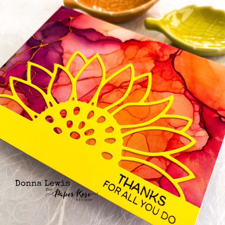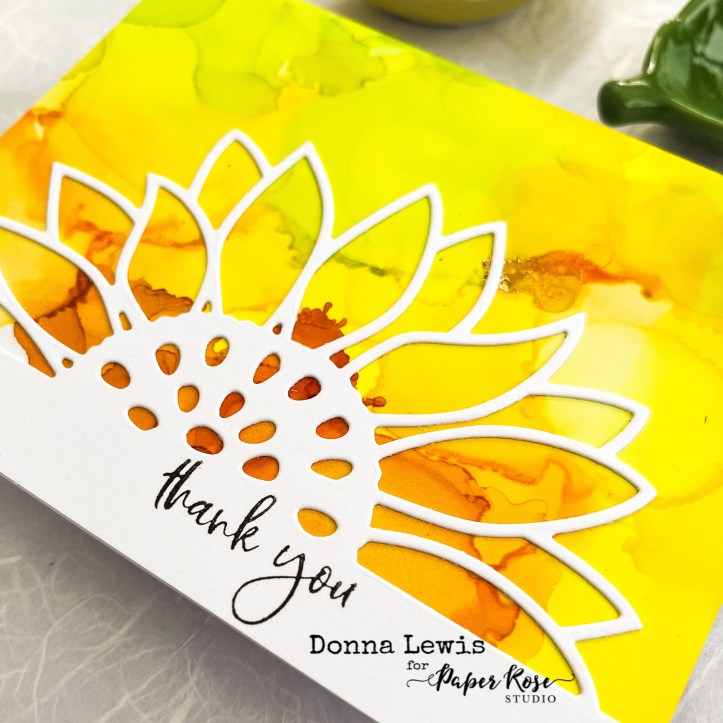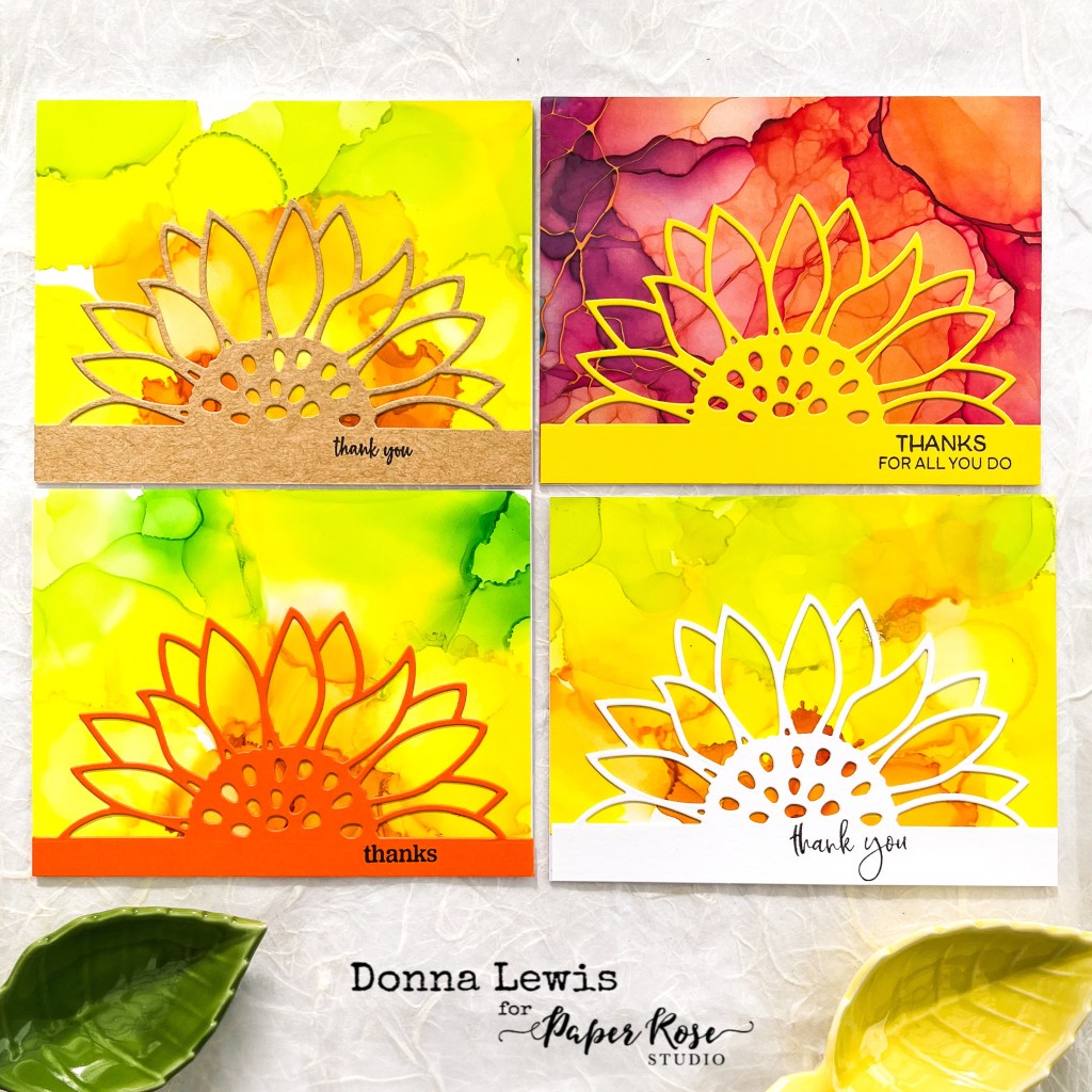 The hero of these cards is the Paper Rose Sunflower Border die. I cut it in a range of coloured card stocks, and stamped some thank you messages along the bottom strip, which the die leaves, using the new Thank you stamp from Paper Rose.