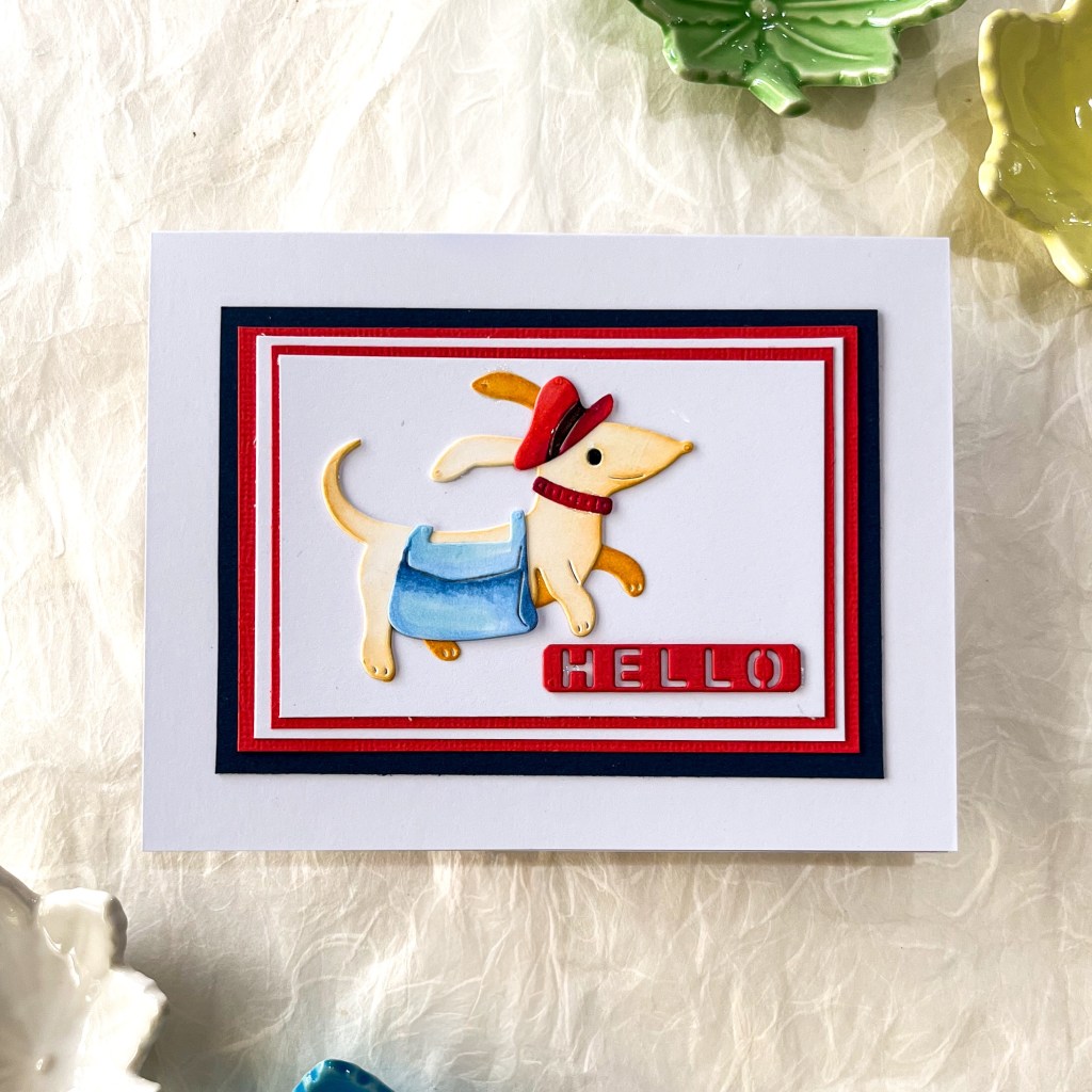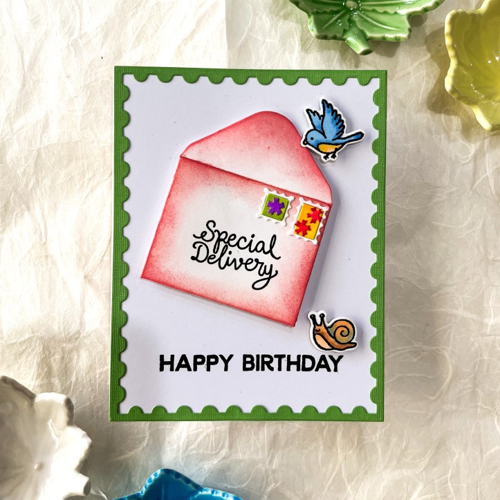 Next, some diecutting and inkblending were used for this card, as well as the bird and snail left over from the first card. I love the large postage stamp border.